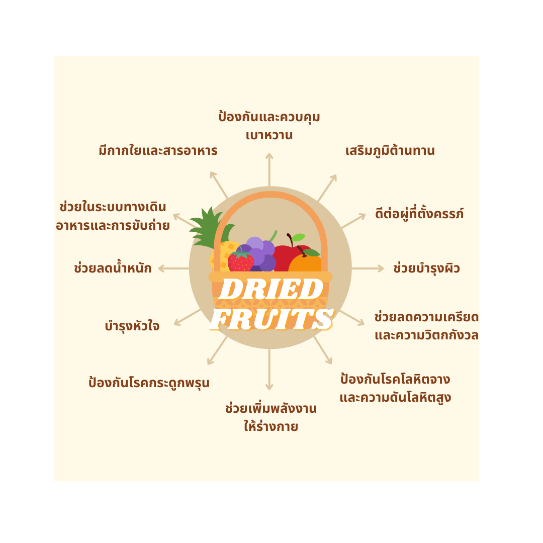 ผลไม้อบแห้งเป็นการทำให้สามารถเก็บรักษาผลไม้เอาไว้ได้นานมากยิ่งขึ้น แถมยังเป็นวิธีการถนอมผลไม้ที่สูญเสียวิตามินได้น้อยกว่าวิธีอื่นๆ ซึ่งการอบแห้งผลไม้เป็นการรีดน้ำออกด้วยกระบวนการความร้อนโดยไม่ทำให้สูญเสียคุณค่าทางอาหารใดๆ เหมาะกับการกินเป็นอาหารว่างยามบ่าย แต่เนื่องจากน้ำที่ระเหยออกจะทำให้ผลไม้มีขนาดเล็กลงและสามารถทำให้เราบริโภคได้มากขึ้น จึงต้องควบคุมปริมาณในการบริโภคผลไม้อบแห้ง เนื่องจากสารอาหารและพลังงานยังคงเหมือนผลไม้สด การบริโภคมากเกินอาจทำให้ได้รับพลังงานที่มากเกินไป