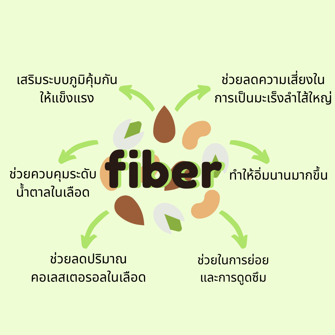 การกินอาหารที่มีไฟเบอร์หรือเส้นใยอาหาร ช่วยให้อิ่มท้องได้นาน ดีต่อระบบย่อยอาหาร ช่วยในเรื่องของระบบขับถ่ายและให้ประโยชน์ต่างๆอีกมากมายกับร่างกาย โดยผู้หญิงนั้นควรได้รับไฟเบอร์ปริมาณ 25 กรัมต่อวัน และผู้ชายควรได้รับไฟเบอร์ให้ได้ประมาณ 38 กรัมต่อวัน แต่การกินอาหารที่มีไฟเบอร์ในปริมาณที่มากเกินไปก็ไม่ดีเช่นกัน