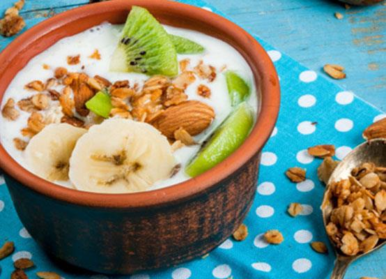 โดยกรีกโยเกิร์ตและอัลมอนด์อบเต็มไปด้วยโปรไบโอติกและสารอาหารอื่นๆอีกมากมาย กรีกโยเกิร์ตนี้มีความเข้มข้นที่เข้มข้นกว่าเมื่อเทียบกับโยเกิร์ตชนิดปกติ เมื่อคุณมีกรีกโยเกิร์ตแล้ว จากนั้นใส่สตรอเบอร์รี่หั่นสี่เหลี่ยมลูกเต๋า บลูเบอร์รี่ ราสเบอร์รี่ หรือผลไม้ชนิดอื่นๆตามชอบ และขั้นตอนสุดท้ายของขนมชนิดนี้คือการโรยอัลมอนด์อบเล็กน้อยเพื่อเพิ่มความกรุบกรอบให้กับโยเกิร์ตของคุณ!